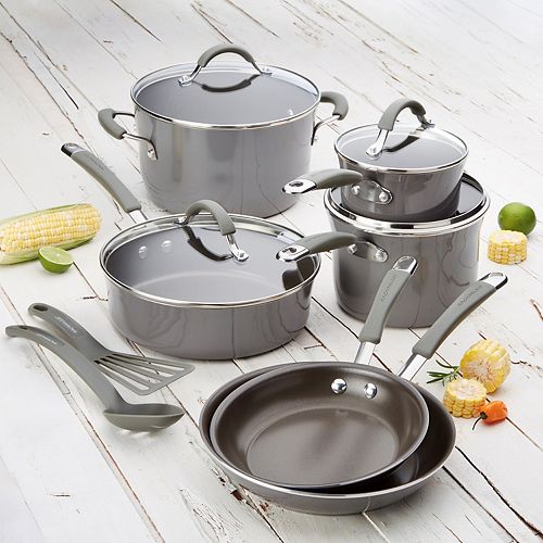 Adding earthy style and color to the kitchen the rachael ray cucina hard enamel nonstick 12 piece cookware set features saucepans skillets and more for creating delicious memorable meals.